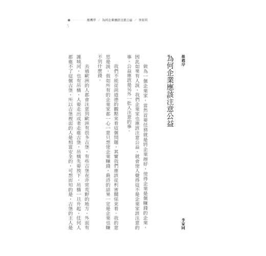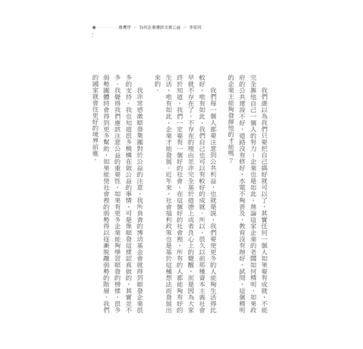 敝人多年從事高階主管教學與擔任國際上最重要的公司治理期刊的副編輯的經驗顯示,全球華人各個國家中,台灣應該是最能發揮公司治理制度的國家。作為亞洲的領先者,台灣已有許多企業家對於公益的實踐都非常受到尊敬,不少企業家除了企業治理能力佳,更具有崇高的品格,但將理念傳播者則較少。本書的出版期望喚起各界有心人士的投入,讓公益型企業所開發出的資源,投入在具有公信力、專業知識、甚至是能夠開放公開討論的公益平台。也希望能促使一般民眾,從消費者的角度,更積極地投入公益鏈的正向循環,以行動支持公益型企業。