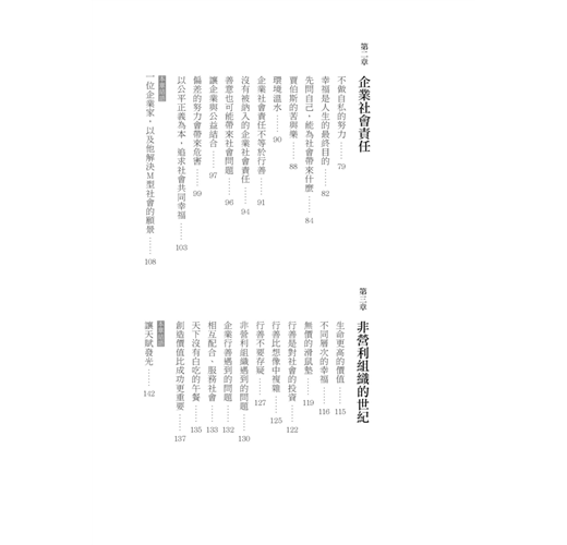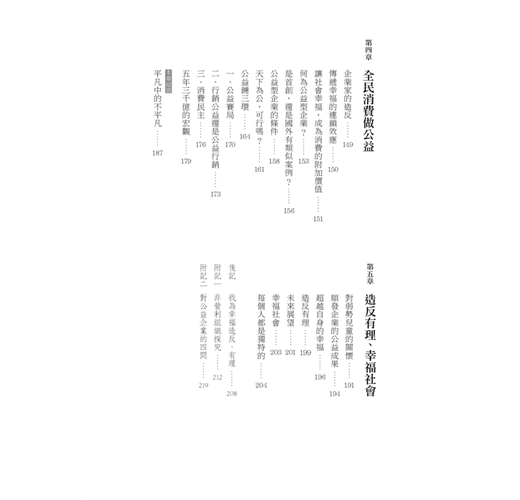 本書也特別介紹公益型企業與公益鏈,能使民眾在消費時,就能為社會帶來幸福回饋的機制,也使企業工作者在為生活、為自我努力的同時,也能為社會共同的幸福產生實際的貢獻。公益型企業與公益鏈的重心與目標,就是放在公益與社會回饋的本質目標上,以為社會帶來最大效益為宗旨。