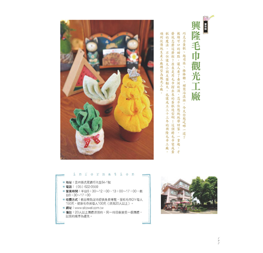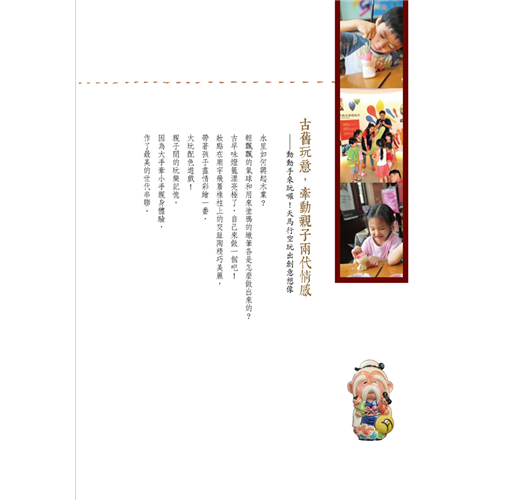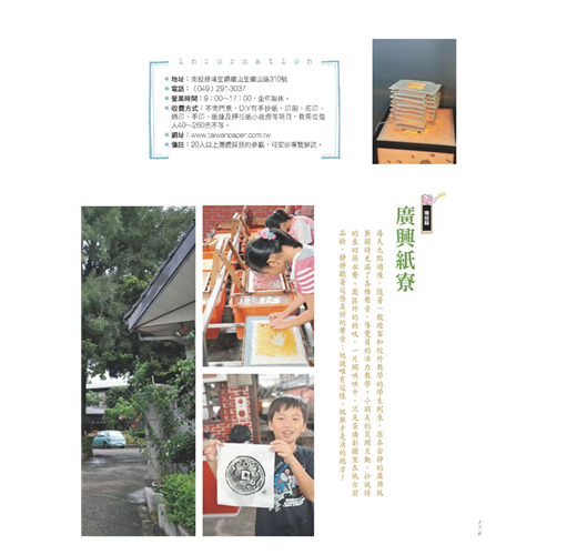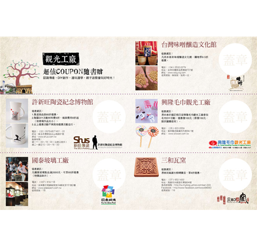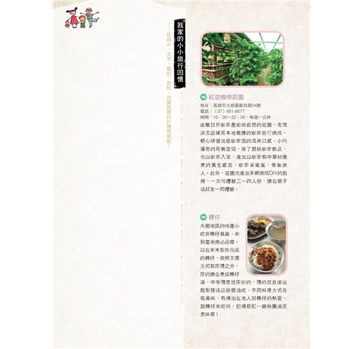 5. 收藏回憶的禮物:本書強調親子邊玩邊記錄旅行中的回憶,在旅遊每家觀光工廠之餘,都規劃一個小空間,讓親子用相片、文字、戳記、剪貼,收藏旅遊的回憶和感動……發揮「親子創作」的概念,完成後,即是一份爸媽送給自己和孩子的珍貴禮物。