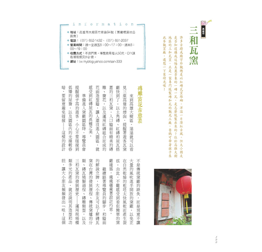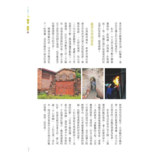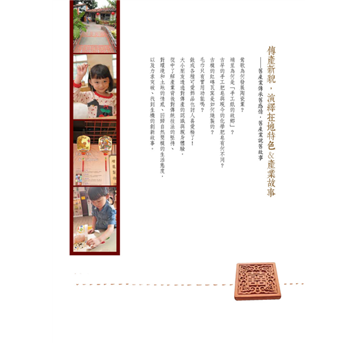 跟著本書的腳步,一同走入爸媽早年生長的時空裡,藉由一塊磚、一個手製燈籠、一個親手捏塑的陶器……認識生活裡的日用品從何而來;舊時的童玩如何既創意又有趣;了解產品和地緣之間微妙而緊密的關係……換句話說,觀光工廠在開創新面貌之餘,它更是一條時光的線索,循著前進,親子可以重溫舊時光、話當年,一一串起很多情感、故事和回憶……