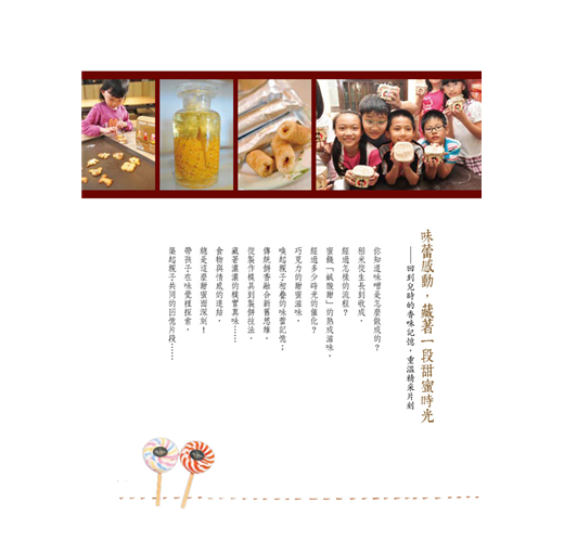 當今物資豐富,孩子要吃什麼糖果餅乾、零食飲料,種類多到令人眼花撩亂。隨著時代變遷,早年樸實的美食記憶已不復見:街角賣著枝仔冰、芒果乾、金柑仔糖的「柑仔店」──孩子童年挖掘食物的寶庫,早已被一家家的便利超商所取代;以往傳統市場裡作糕餅糖果、米食醬料的老店,也多數不敵現代化大量生產的工廠而陸續關起大門;孩提時駐足圍觀糕、餅、粿、糖起灶、出爐的景象早已不在,等候爆米香砰地一聲的驚喜,還有引頸期盼賣麥芽糖、麵茶小推車經過的心情,也沒了著落,這不免讓許多身為父母的大人們感覺些許悵然;每當回首童年往事與那令人想念的滋味時,總少了一些精彩片刻。
