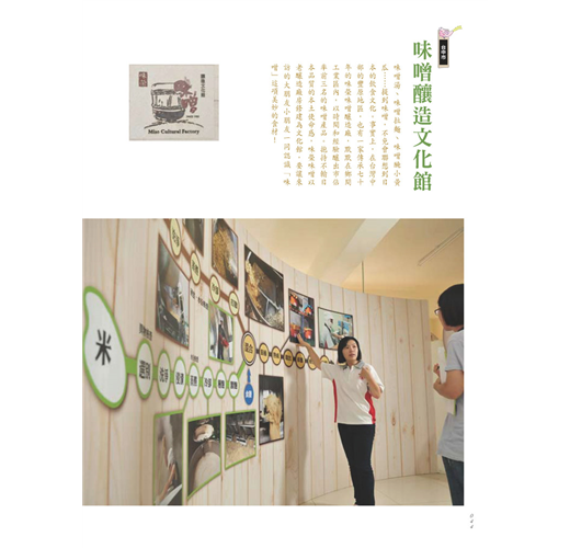 味噌是日式食品,由於台灣在西元一八九五年之後,有長達五十年的日本殖民時期,所以味噌早已成為台灣的國民美食之一。位於台中豐原的味噌釀造文化館,是由已經有七十年歷史的味榮味噌所修建,而鎮館之寶,就是六十五年前遠道從日本運送而來的古物──超過百年歷史、高達三層樓高的味噌熟成桶。這個龐然大物,直接說明了味噌製作過程「熟成」的重要性。來到這兒,父母不用帶孩子遠赴日本,就能瞭解原汁原味的日式味噌製作過程。