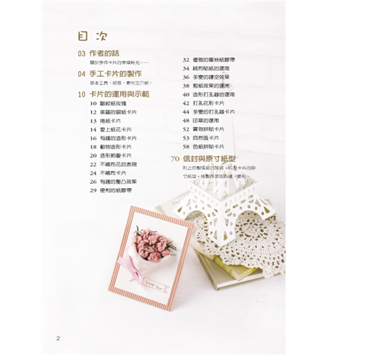 手工卡片的製作十分簡單,表現的形式也非常多元,無論是實物拼貼、色紙拼貼、鏤空、壓凸、剪紙、立體造形、捲紙、摺紙、手刻印章等,都是既簡單又實用的技法。只要利用極易取得的工具、紙張與素材,就可以製作出千變萬化的卡片。此外,也可以選擇市售的自然素材、紙膠帶、布質膠帶、特殊貼紙、絨布轉印貼等等便利多元的現成小物,豐富你的卡片。