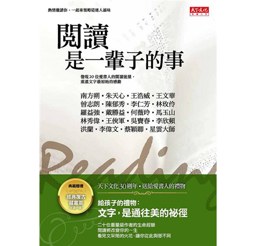 二十位各領域名家暢談自己的閱讀經驗,包括他們如何愛上閱讀?閱讀如何改變他們的生命?閱讀發生在怎樣的時空裡?閱讀對他們有多重要?從不同的專業領域,不同的閱讀口味,不同的閱讀方式,展現閱讀種種不同面向。期待與形形色色的讀者激盪出各種不同的火花。