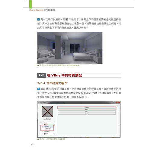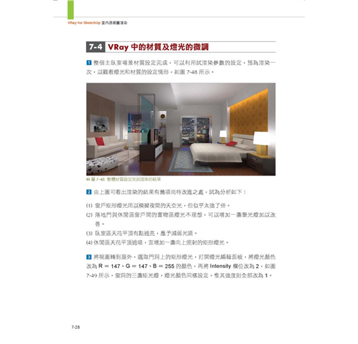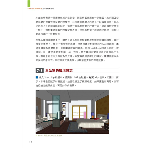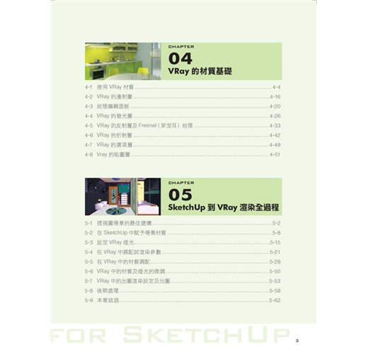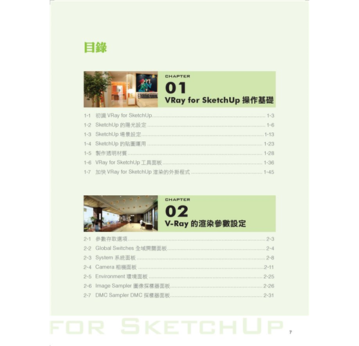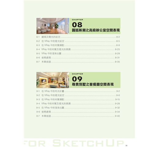 第六章至第十章就各類型室內空間,以室內設計實作場景做為範例,模擬各種空間情境的設定,做為從VRay佈光、材質設定到渲染出圖一整套系統的操作說明,一步步引導讀者以SketchUp直觀設計概念,及輕鬆愉快心情,完成各情境的練習,以增加軟體操作熟練度,以應付往後職場中各樣場景的嚴酷考驗。