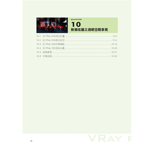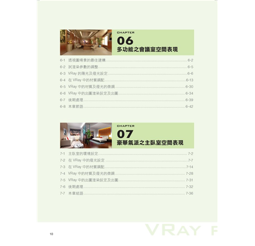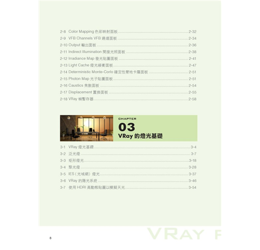 第二章至第四章,為VRay軟體的指令操作教學,以有條理的分析及循序漸進的方式,解說渲染參數設定及燈光與材質基礎等基本介紹,以做為往後實例操作的根本。