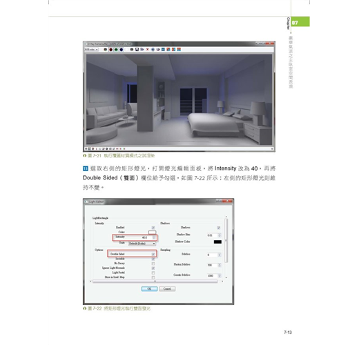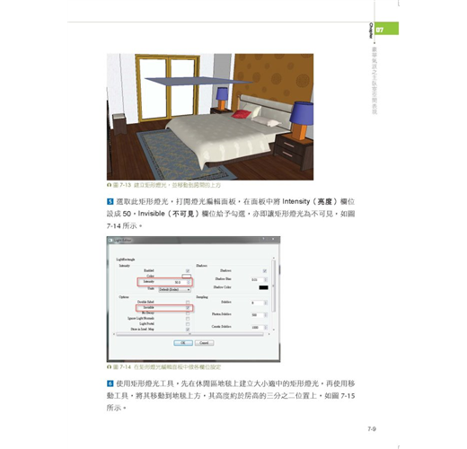 以室內各類型的六個景場,做為VRay佈光、材質設定及渲染參數的調配,均有精闢的解說及示範。