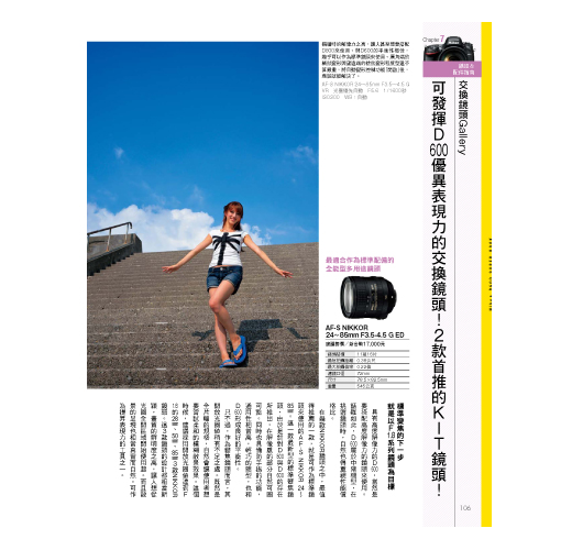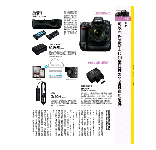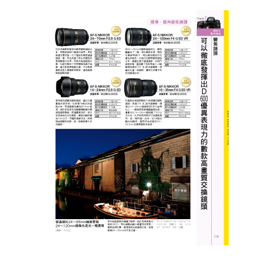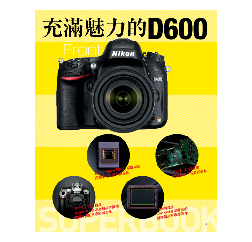 此外,更針對相機的選單提供完整介紹,嚴選數款可以完整發揮D600超高解像力的交換鏡頭,必且介紹實用的各項配件,讓用戶可以更加瞭解這台超高性能的影像創作工具,進而拍出極富水準的相片。