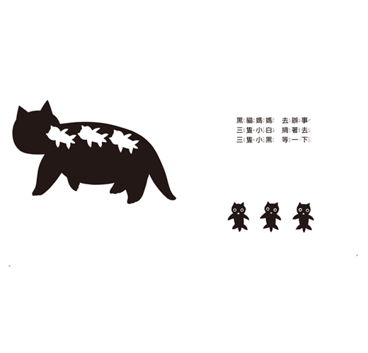 在畫面上,黑與白的對比加上單純的造型,讓黑貓媽媽、三隻小白...