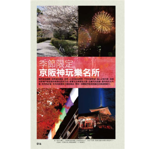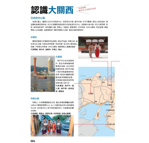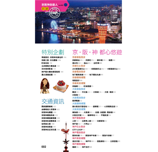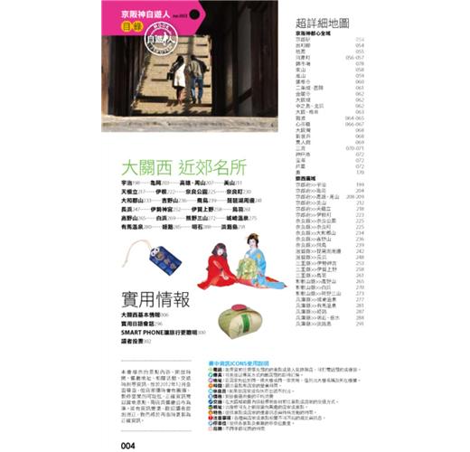 本書分為京阪神與近郊二部分,第一部分先以交通方式帶出遊玩京阪神的順遊路線,再以主題帶出該區域的流行議題。第二部分則將關西近郊的各個精彩景點拉進分區,從琵琶湖到淡路島,城崎溫泉到熊野三山,藉由詳細的交通圖解與景點介紹,漫遊廣大的關西區域不再是難事。