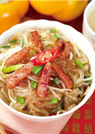 這道粉條最早是外婆做給我們吃,據說是日本的吃法,粉條也是外婆親手製作。在我的印象中,一般人吃的粉條,就是剉冰裡加的那種,在我家向來是吃鹹,以致我第一次看剉冰裡放了粉條時,忍不住說了:「好噁心喔!」據說不少人也完全不能接受吃鹹的粉條,不過這道香腸炒粉條是我很有自信的一道,煎得噴香的香腸和吸飽了甘甜醬汁的粉條,非常值得一試。
