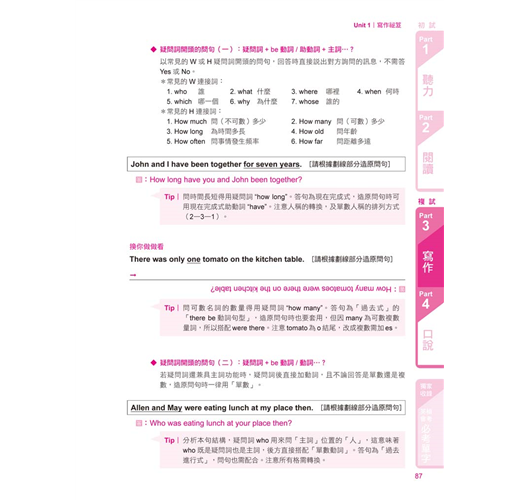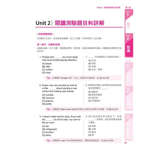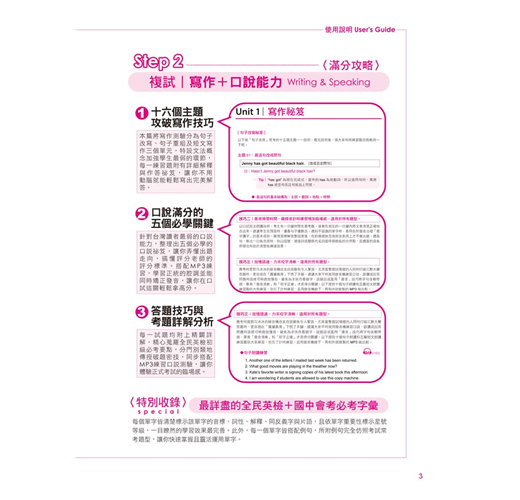 本篇將寫作測驗分為句子改寫、句子重組及短文寫作三個單元,特設文法概念加強學生最弱的環節,每一練習題附有詳細解釋與作答秘笈,讓你不用動腦就能輕鬆寫出完美解答。