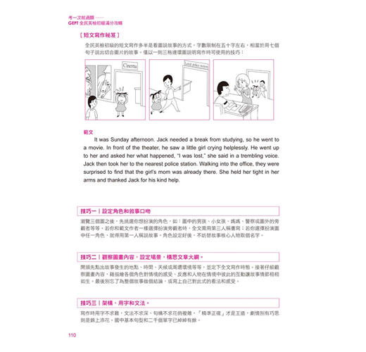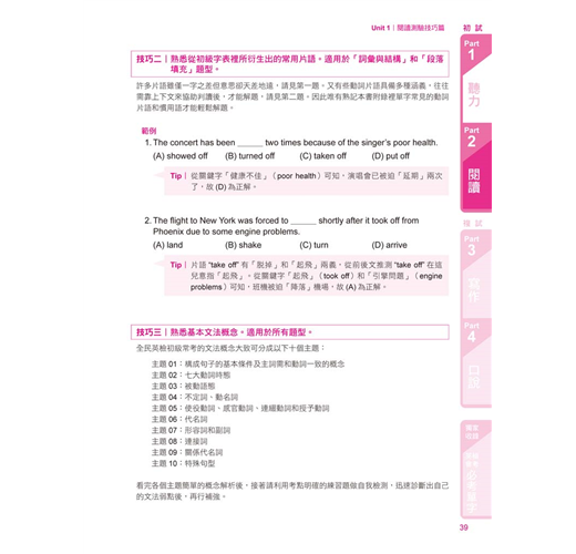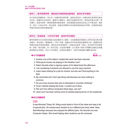 針對考生最容易失分的閱讀測驗,共歸納了五大技巧,並詳細整理了歷年來全民英檢初級的出題方向,讓你迅速抓對考試重點及文章脈絡,破解閱讀測驗。
