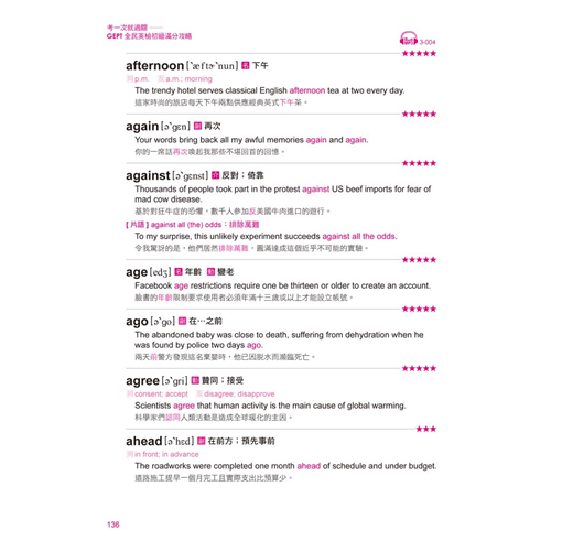 每個單字皆清楚標示該單字的音標、詞性、解釋、同反義字與片語,且依單字重要性標示星號等級,一目瞭然的學習效果最完善。此外,每一個單字皆搭配例句,所附例句完全仿照考試常考題型,讓你快速掌握且靈活運用單字。
