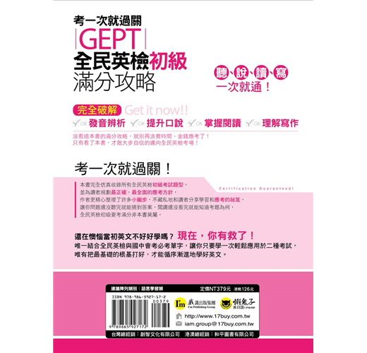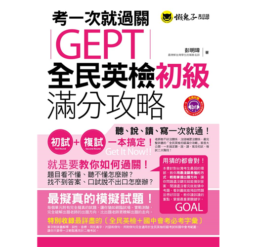 《考一次就過關GEPT全民英檢初級滿分攻略》針對台灣考生最弱的環節,教你用最淺顯易懂的方式,輕鬆掌握出題方向,讓你問題還沒聽完就能猜到答案,閱讀還沒看完就能猜中考題,看到圖就能預設問題並想好回答。並教你讀該讀的重點,掌握最重要關鍵字!