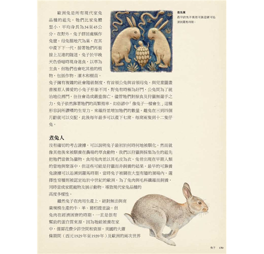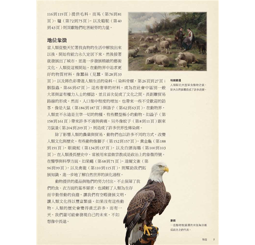 數萬年前,人類(第210到217頁)形成小團體,過著四處游蕩、以採集與打獵維生的生活。這樣的生活方式,跟狼(第44到47頁)其實沒有什麼兩樣。而狼之後也成為最早被人類馴化的動物,經過好幾代的篩選育種之後,就成為人類養的狗(第48到51頁)了。在人類發現動物除了是會移動的肉與毛皮來源之外,還可以為生活帶來更多好處後,人與動物的關係就永遠改變了,從獵人變成了牧民。原本是人類獵物的草食動物,現在不止是人類的肉品來源。牛(第34到39頁)與山羊(第52到55頁)提供鮮乳,綿羊(第142到147頁)與大羊駝(第116到119頁)提供毛料,而馬(第76到81頁)、驢(第72到75頁),以及駱駝(第40到43頁)則貢獻牠們吃苦耐勞的力量。
