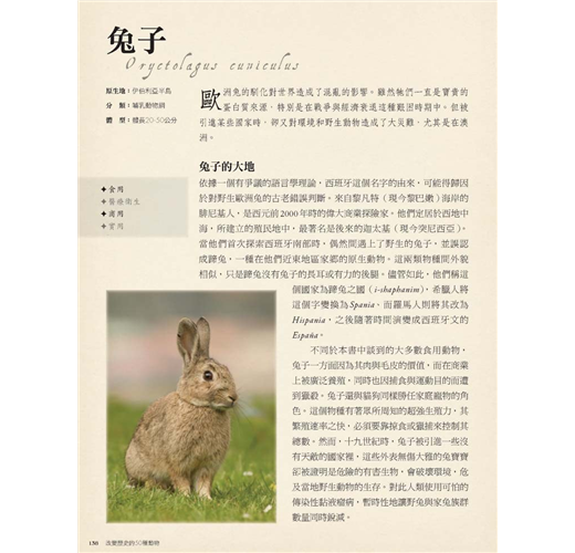「我們常常沒有意識到人類並不是孤獨地活在這個星球上。人類早在建立起文明之前,就已經跟地球上許許多多多的動物們共同生活了千萬年之久。其中有些動物與人類的關係特別密切,一部份與人類一同演化,彼此互蒙其利,也有一部份卻被人類迫害甚至滅絕於世,更有些動物卻是藉著加害人類,讓自己活得更興旺。無論是那一種動物,牠們的生命都與人類產生緊密的關係,在人類文明的建立與發展過程中,各自扮演了鮮明的角色。本書即由人類文明的發展過程中,找出五十種影響最深遠的動物,逐一剖析牠們在人類歷史發展中的地位,闡明我們人類原來與世上動物們的因緣糾葛,竟是如此地深遠綿長。」──本書譯者王建鎧