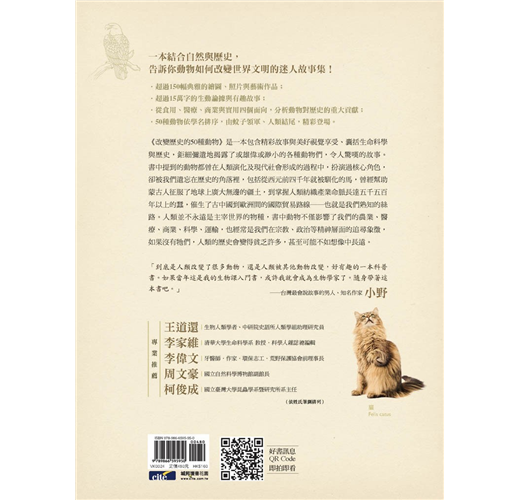 《改變歷史的50種動物》是一本包含精彩故事與美好視覺享受、囊括生命科學與歷史,鉅細彌遺地揭露了或雄偉或渺小的各種動物們,令人驚嘆的故事。書中提到的動物都曾在人類演化及現代社會形成的過程中,扮演過核心角色,卻被我們遺忘在歷史的角落裡,包括從西元前四千年就被馴化的馬,曾經幫助蒙古人征服了地球上廣大無邊的疆土,到掌握人類紡織產業命脈長達五千五百年以上的蠶,催生了古中國到歐洲間的國際貿易路線──也就是我們熟知的絲路。人類並不永遠是主宰世界的物種,書中動物不僅影響了我們的農業、醫療、商業、科學、運輸,也經常是我們在宗教、政治等精神層面的追尋象徵,如果沒有牠們,人類的歷史會變得貧乏許多,甚至可能不如想像中長遠。
