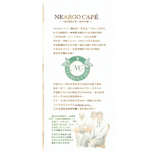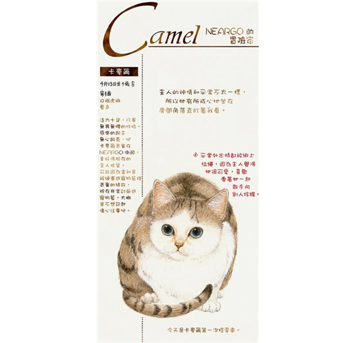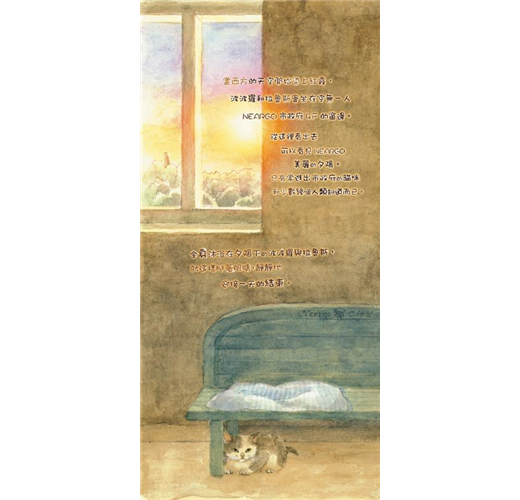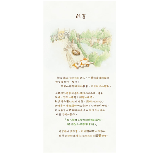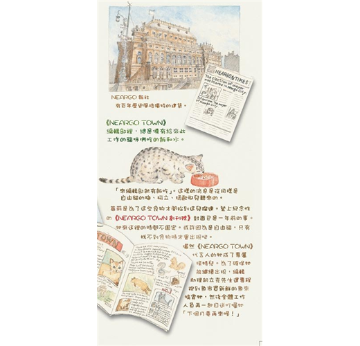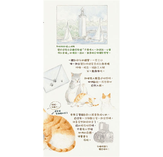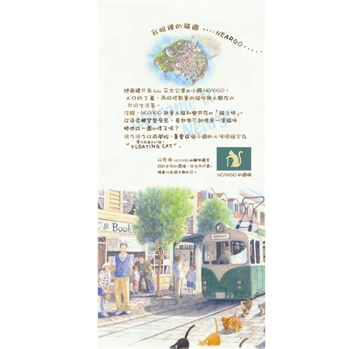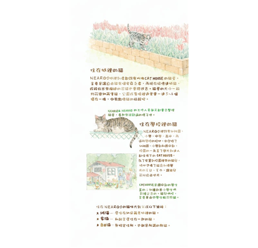 生活在這兒的每隻貓咪,不論大貓、小貓都天真爛漫、眼神無邪,而且對人毫無防備,四處可見悠哉的四腳朝天睡大覺的逗趣模樣,人與貓咪之間充滿了故事。Neargo也是一處優美的島嶼,作者以柔和的筆觸,讓Neargo迷人的風景彷彿躍然於紙上,讓人有如置身於「貓之城」的Neargo般。