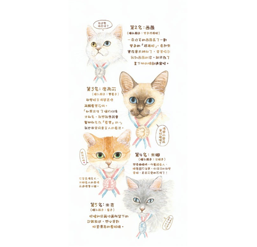 在這個城市裡,人與貓和樂相處,每隻貓咪的樣貌、個性、癖好、生長背景、甚至職業,以及和人類之間有趣的互動,或是貓兒們所想的、思考的,都透過作者細膩的插畫與俏皮逗趣的文字傳神地浮現紙上,彷彿就在你我的身邊。你一定會覺得很奇怪,為什麼作者會這麼了解貓兒的心思,因為,她……會說貓的語言,是真的!