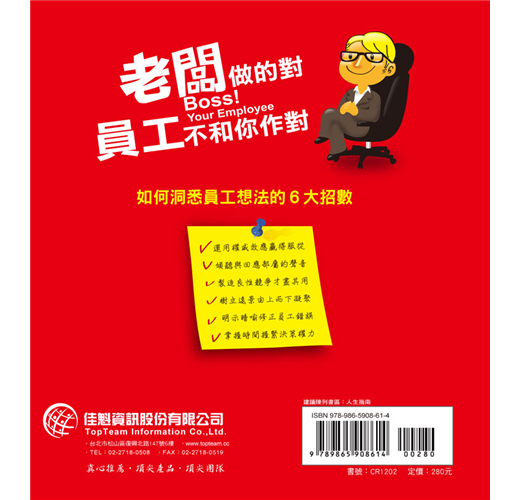 老闆總是想管理好底下的員工,期望部署有效率和上進心之外,也希望和員工們保持良好的關係。想要打破老闆和部署間對立關係的藩籬,就從做「對」的管理開始!如何做好對的管理、下對的指令、正確的處理部署丟出來的難題,就從抓住部署的心做起。