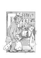櫻婆婆往外一看,一隻巨大的青鬼站在門口。頭上長著一對堅硬的金角,手裡拿著大袋子、鐵棒和傳單,在那兒大呼小叫: