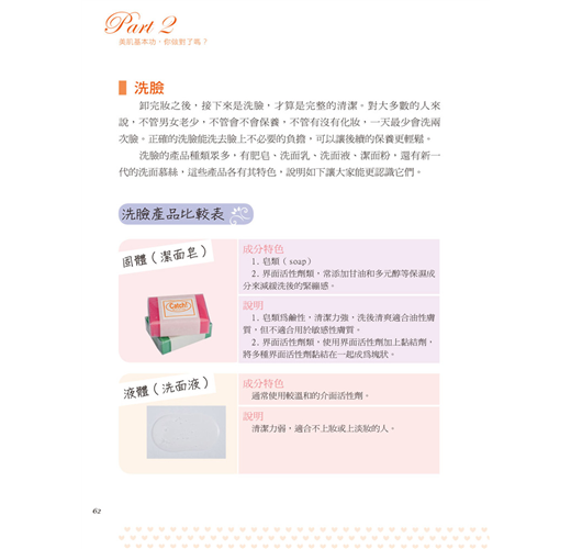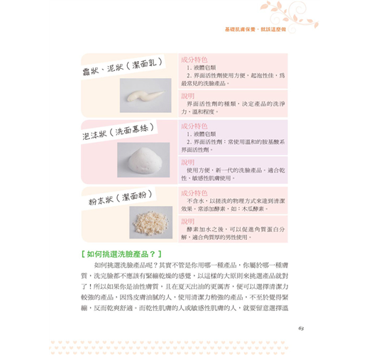 ◎ 美肌基本功,卸妝保養輕鬆做:從基礎保養的清潔卸妝開始,延伸到各種護膚產品,如:化妝水、精華液、乳霜,以及進階保養的面膜產品、眼霜、去角質,一直到防曬乳、BB霜的選擇,告訴你最正確的美肌保養基本功,讓你肌膚零瑕疵,靠再近也不怕。