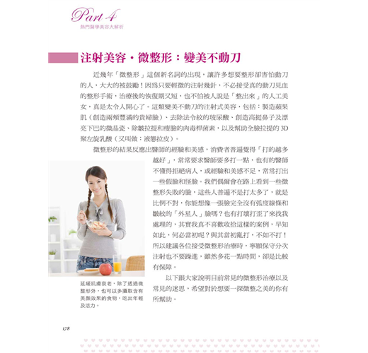 ◎ 施展醫美小魔法,讓你有好「醫」Q:淡化斑點、緊緻毛孔,還你透亮無瑕的蘋果肌……,別懷疑,宣稱能辦到這些的不是魔法,而是醫學美容。如何選擇最適合自己的醫美療程,術前準備、術後保養等你所關切的所有小細節,本書都完整大公開,絕無保留。
