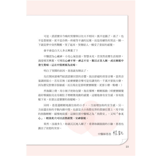 ● 全彩圖解,透過北京中醫藥大學副教授兼中醫師爸爸–程凱,為早產女兒解除新生兒最容易發生的各種疼痛經驗,再搭配北京大誠中醫門診部主任–陶冶,用老祖宗的育兒智慧,還有醫師爸爸的寶貝女兒親自示範128種對症按摩!