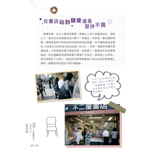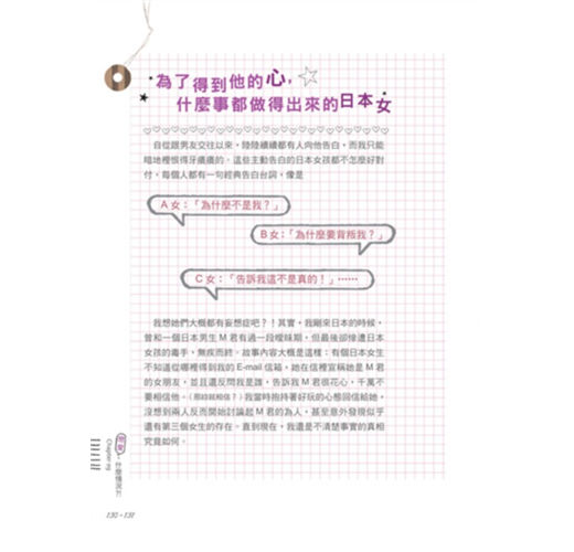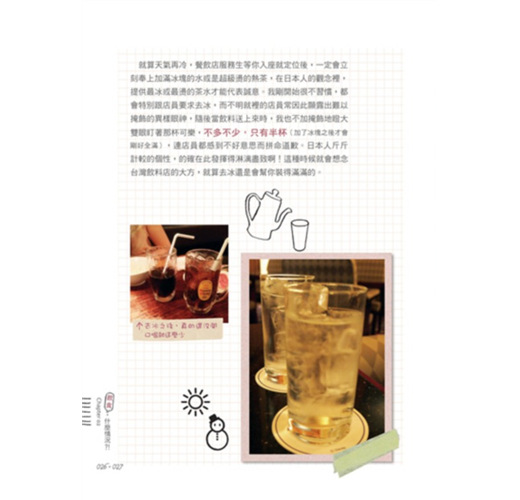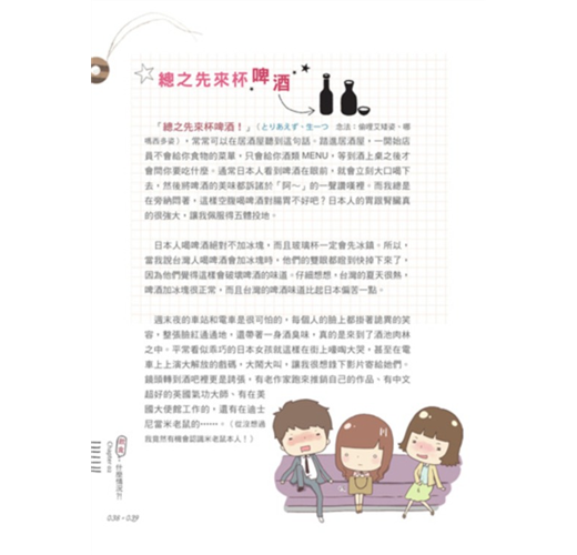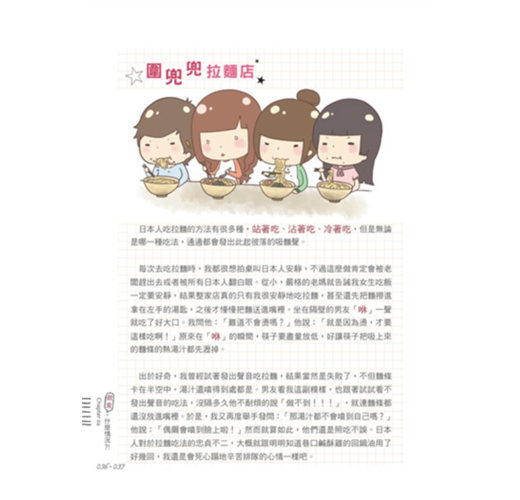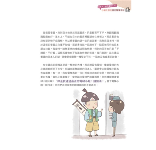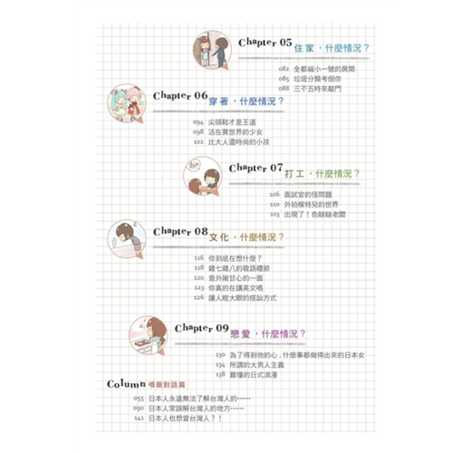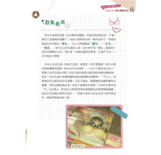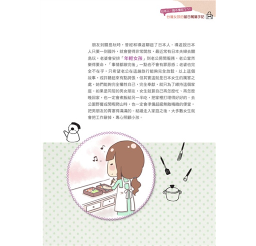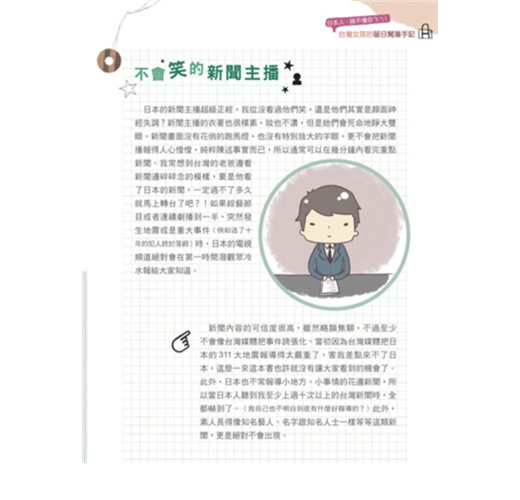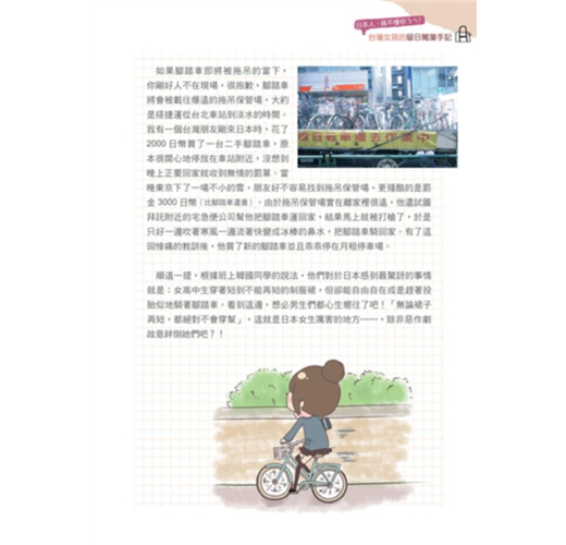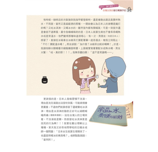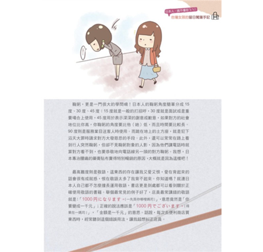 在 miho 的細心觀察與逗趣文筆之下,我們可以一窺各種面向的日本樣貌,像是交通的、飲食的、生活的、戀愛的......,透過這本書能夠讓你更瞭解日本人/日本文化一些,也因此對日本產生更具體的立體印象!