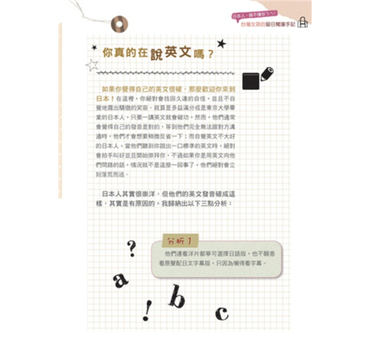複雜的垃圾分類規矩。麥當勞被念成「罵苦多納魯多」,你真的在講英文嗎。所謂的大男人主義。日本人永遠無法了解台灣人。日本人常誤解台灣人。日本人也想當台灣人…