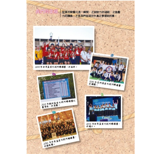 尤其是二0一0年那次南非的室外比賽經驗更是深刻。因為雖然之前已經有了義大利世界盃室內比賽奪冠的經驗,但其實當時景美女中在國內的室外成績不甚理想。在幾個月密集的操練之後能拿回世界冠軍,對整個團隊來說都別具意義。選手們應該牢記的,不止是結果,而是那份挑戰不可能的精神。