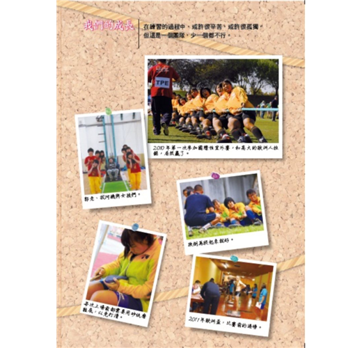 二0一二年三、四月間的一場國內比賽裡,突然有一位陌生的國小拔河隊教練拿著小學課本來讓學生簽名,還要我在上面寫幾句鼓勵的話。他告訴我,教科書裡有一課在講景美女中拔河隊的故事,今天剛好遇上我們,希望能請我們簽名回去鼓勵他們的學生。我們從來不知道有一天自己也能變成課本裡的人物,感覺好特別,雖然是股壓力,卻也是種鼓勵。