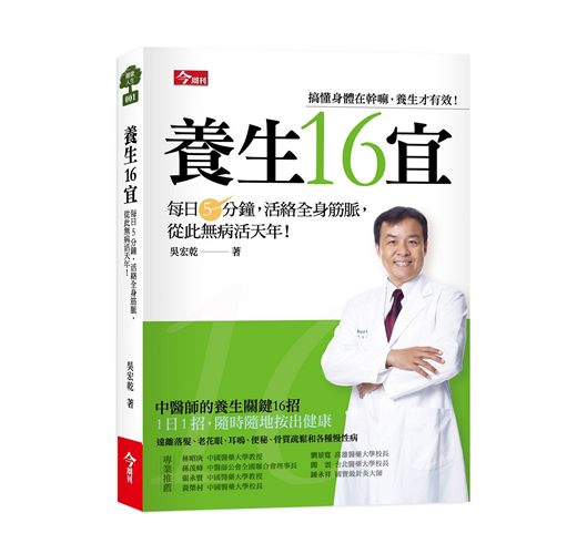 吳宏乾重新編寫養生16宜的內容,加上1分鐘的身體檢測、和簡易操作的按摩法,以及對症調配的食譜,讓讀者能隨時隨地實際操作,輕鬆在家自我養生。