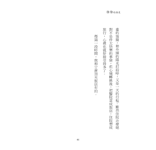這本書裡,沒有花俏的文字堆砌,樸實真摯的字字句句,訴說著徐徐三年來淡淡的卻又不平凡的歲月,讓他充實快樂的,也許正是一路走來,身處病痛中還能努力成就自己、成為自己的那股勇氣與熱情。