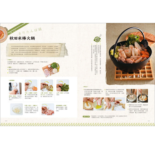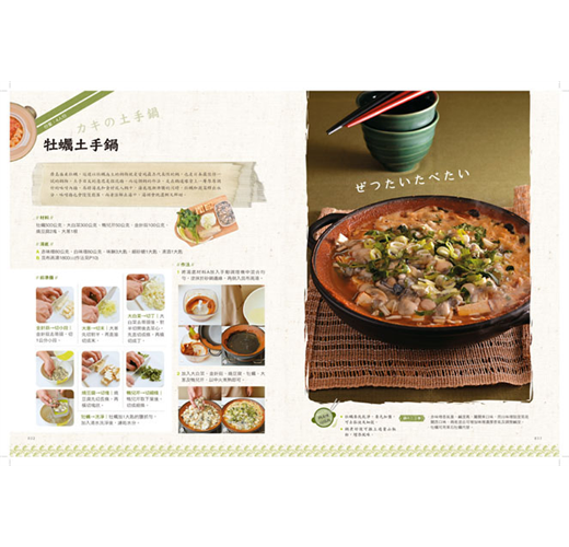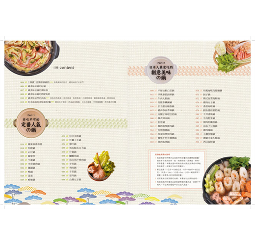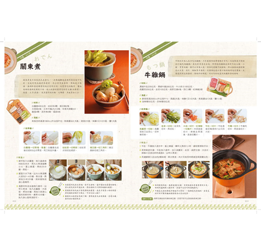 日本人吃鍋物已有很長時間,已經是飲食文化的一部分,仔細觀察發現很多知名的鍋物,都是和地緣、季節大有關連,即是「旬菜」的概念,故本書中介紹這些具代表性,連當地人都愛吃的鍋料理,包括有:「牡蠣土手鍋」、「秋田米棒鍋」、「牛雜鍋」、「鮟鱇魚鍋」、「水炊雞肉鍋」、「螃蟹鍋」…;還有台灣常見及受歡迎的鍋物,有「壽喜燒」、「石狩鍋」、「關東煮」、「相撲鍋」…都屬於這類。