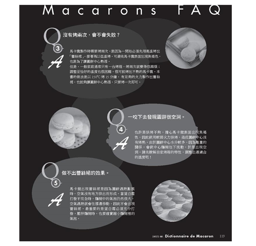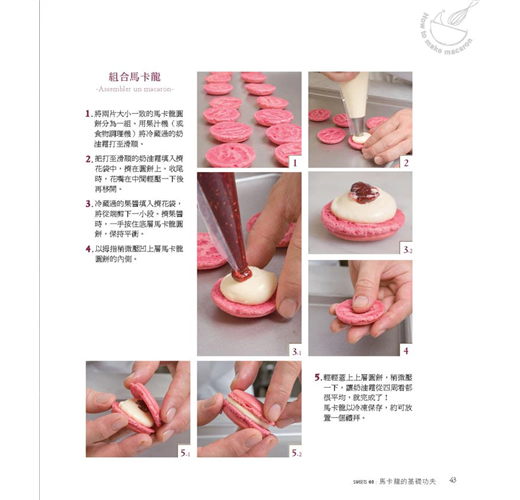 即使自己在家動手做,也能跟洋菓子店裡賣的一樣色味俱佳。 應該是史上最多圖解步驟的馬卡龍料理書了,跟著主廚的示範,一步一步完成,想失敗還真很難!