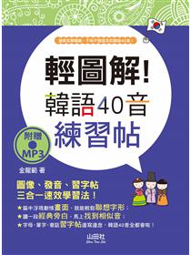 以30頁的份量練習韓語40音,包含基本發音、組成方式、查韓語字典的介紹。用40音習字帖、40音跟讀、聽力、單字書寫、句子理解等練習內容,不但學會標準40音發音,也學會正確寫法,同時學會單字及其標準唸法,自學無障礙,老師用來安排回家作業也輕鬆。