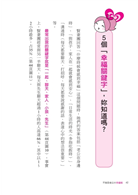 「婚後我一定要幸福,永遠與老公相親相愛。」婚前這個充滿希滿望的願景,必須從日常生活中一點一滴用心實踐,才會美夢成真。實踐幸福計畫需要的步驟和技能,都在這本書裡!這不只是一本實用且充滿幸福的書,它同時也滿載祝福,祈願每位讀者都能和心愛的他,一同創造幸福圓滿的人生!