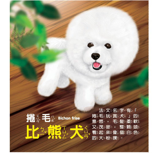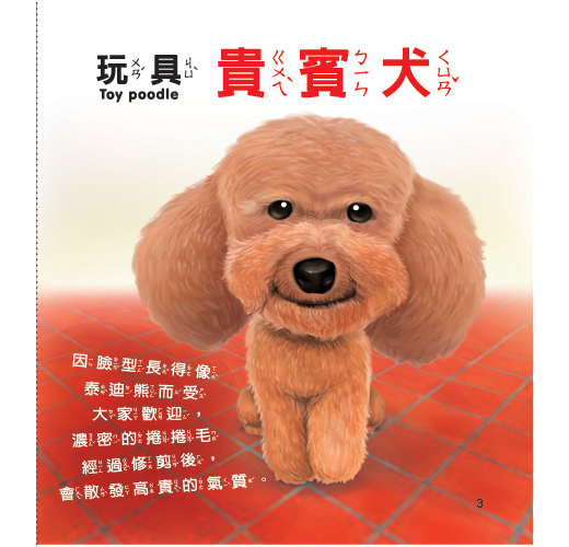 透過寫實又可愛的圖像,讓孩子認識時下流行的寵物狗狗及中英雙語名稱,針對每種不同狗狗還有簡短介紹,可學習辨識狗狗的品種特徵。