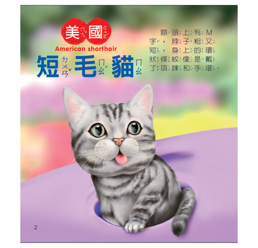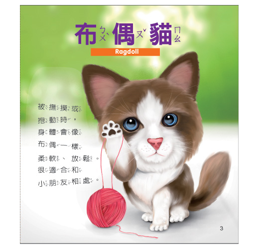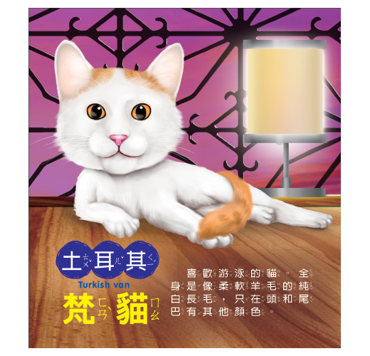 透過寫實又可愛的圖像,讓孩子認識時下流行的寵物貓貓及中英雙語名稱,針對每種不同貓貓還有簡短介紹,可學習辨識貓貓的品種特徵。