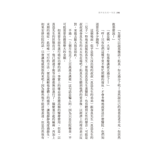 原本想再說服他的,但腦海中卻交錯了各種想法,一時無法理出頭緒。說不出任何話了。也許真的治不好了……惠子太太自己也存在著這種想法,所以她只得承認,任何反駁的話都不再具有說服力。但是,這種事她根本說不出口。