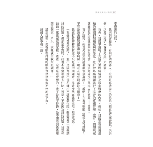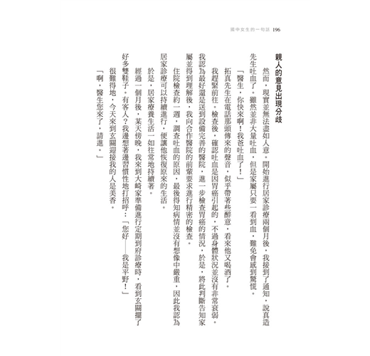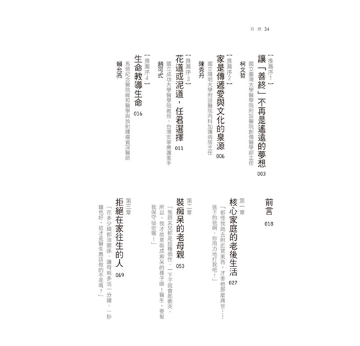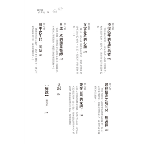 也許有的案例正好與拿起這本書的你,有著類似的生活環境;也許有的案例在你看來,根本就像是另外一個世界所發生的事。不過,無論是哪一則案例,相信都能在你與最重視的人度過最後一段日子時,帶給你很大的啟發。」