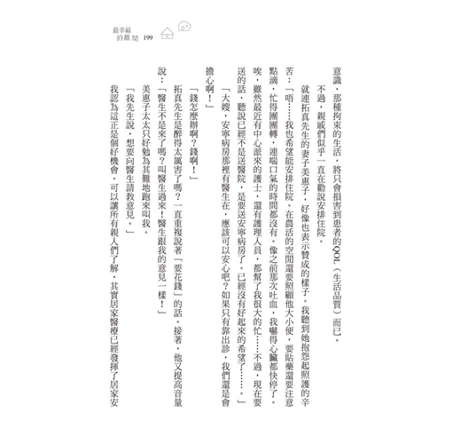 「醫生,我不希望做那些痛苦、激烈的治療來延長自己的生命。我啊,想要死在這個家裡啊……。」