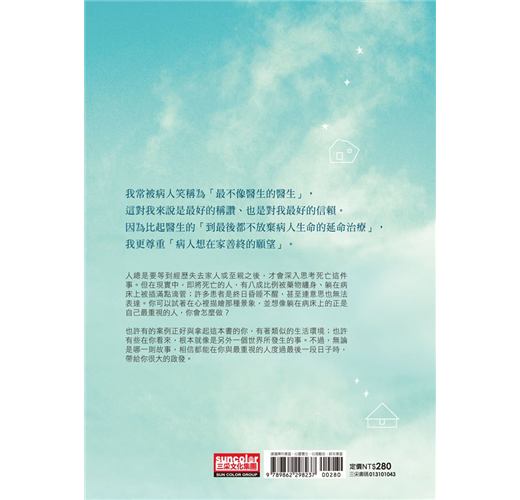 現代醫學興起,醫院之建立,維生系統之進步,卻反而使「善終」變得那麼困難、變成一個難以達成的目標。然而,面對問題是解決問題的第一步,唯有當醫生也願意「醫死」,開始把病人善終當作是醫師的一件大事,這些問題或許在將來才有改進之可能。本書以一名出診的居家照護醫師之所見所聞,平實的敘述生死之間的故事,應該算是拋磚引玉,讓我們大家透過閱讀這些故事,而能深入去思考怎樣才算是「善終」?生命末期病人在醫院中接受那些「延命治療」,真的需要嗎?唯有更多的思考和討論之後,當我們不再避諱談論死亡議題時,「善終」才不會是那麼遙遠的夢想。