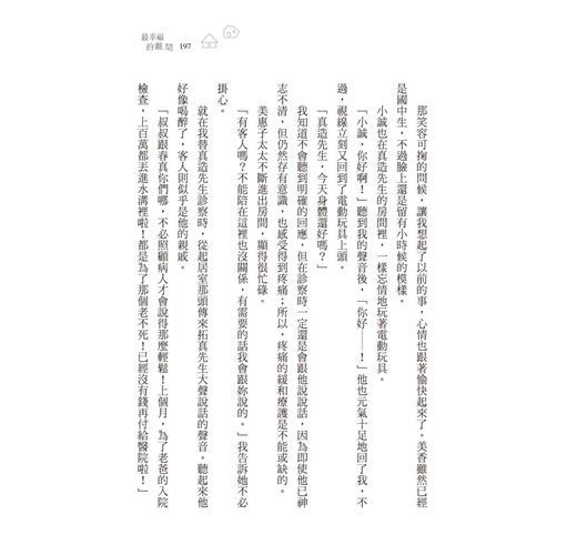 在一間沒有病人候診也沒有先進醫療設備的診所,只有ㄧ位醫生穿著便服到病人家裡出診。或許只要個聽診器就夠了,在閒話家常間,拉近彼此的關係、了解各樣大小事,在擺脫了醫療儀器冰冷的框架之後,卻看到了病人家庭角色、社會功能、連帶著身、心、靈層面的議題,這是真正全人的照護。我動容於作者能被他的病人稱為「不像醫生的醫生」,因為代表著這位醫師走入病人真正需要的地方、也是令他們最幸福的地方。
