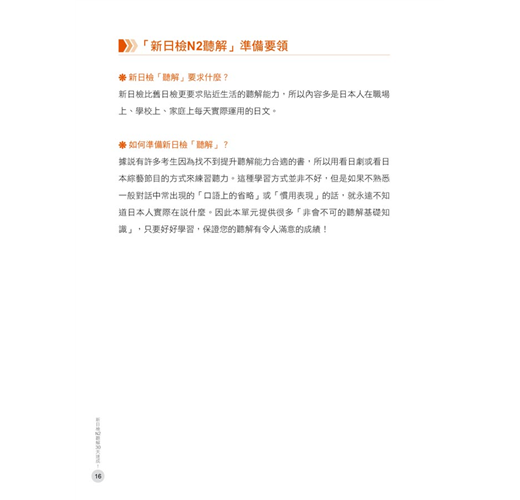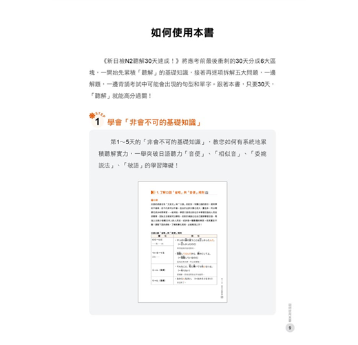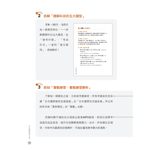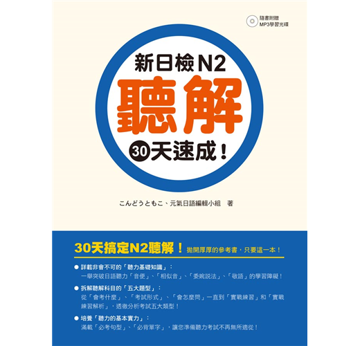 1.全國第一本教考生如何在30天短短時間內準備新日檢「聽解」科目的工具書,書本內容厚度剛好,準備起來輕鬆沒有壓力。