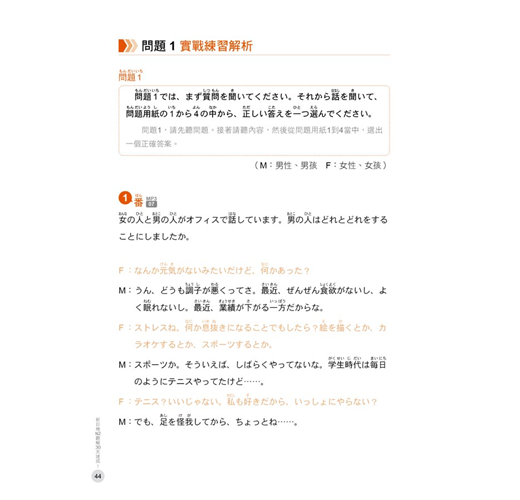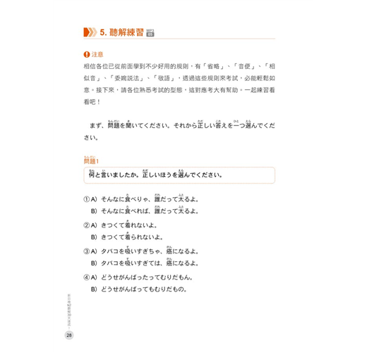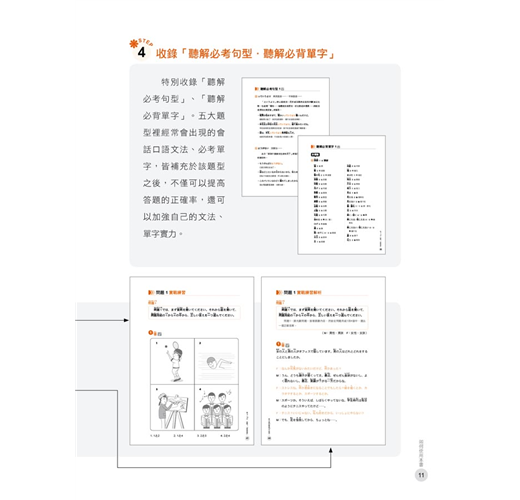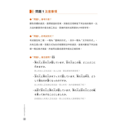 5.5大問題皆附上一回精準、活潑的聽力實戰練習試題,並有原文及中文翻譯,一邊學習方法一邊練習題目,才能提高「聽解」實力。