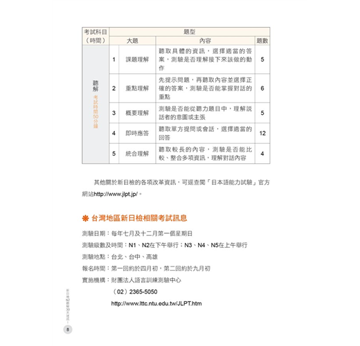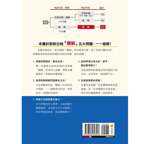 2.由撰稿經驗10年以上的近藤知子老師,完全依據「日本國際教育支援協會」及「日本國際交流基金會」所公布的新日檢「最新題型」與「題數」出題,並撰寫「聽解」非會不可的基礎知識及關鍵要項。