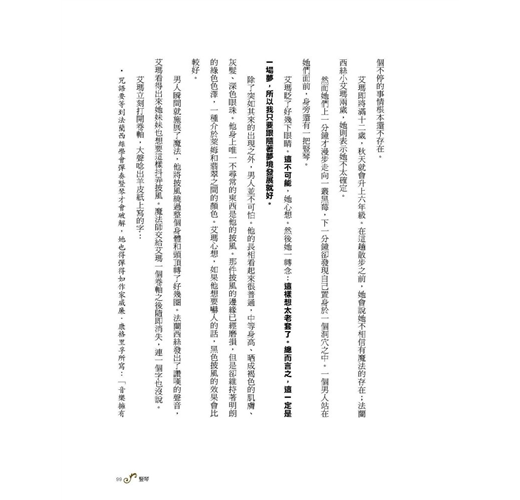 然而她們上一分鐘才漫步走向一叢黑莓,下一分鐘卻發現自己置身於一個洞穴之中。一個男人站在她們面前,身旁還有一把豎琴。艾瑪眨了好幾下眼睛。這不可能,她心想。然後她一轉念:這樣想太老套了。總而言之,這一定是一場夢,所以我只要跟隨著夢境發展就好。
